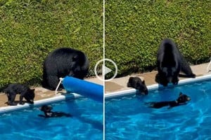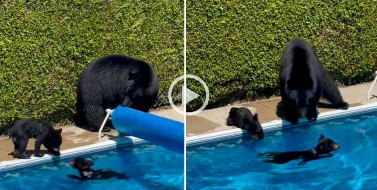 El dueño de la piscina se llevó una sorpresa cuando los inesperados visitantes lo sorprendieron dándose un chapuzón. Después de jugar en el agua, los osos se dirigieron hacia el jardín de su casa en Canadá.