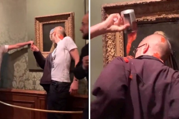 En las imágenes se observa como un hombre pasa el vallado que protegía la pintura e inmediatamente se pega a la obra de arte, mientras su compañero le tira salsa de tomate y luego también se pega a la pared.