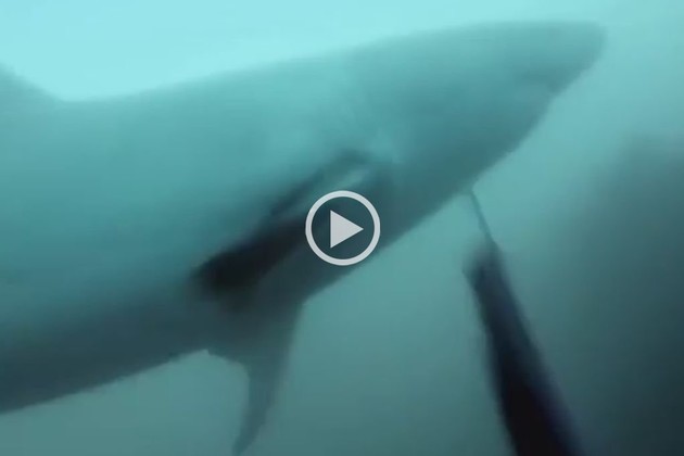 En las imágenes se observa cómo el tiburón aparece en escena sin que el buzo se percatara de su cercanía y, gracias a su arpón, logra que el animal se aleje en varias ocasiones.