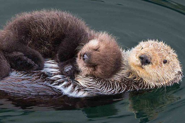 En el mismo se puede observar cómo el pequeño animal utiliza el vientre de su madre para descansar y la nutria lo envuelve, a manera de protección, mientras ambos están sobre el agua.