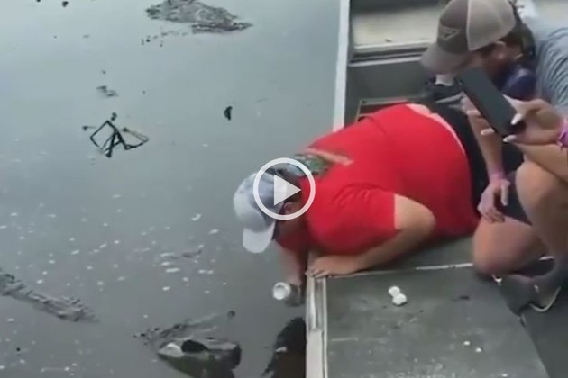 El hombre se encontraba junto a un grupo de personas en una lancha y, cuando lograron que el caimán se acercara y abriera la boca, el hombre rápidamente introduce la bebida y consigue agujerearla con sus afilados dientes.