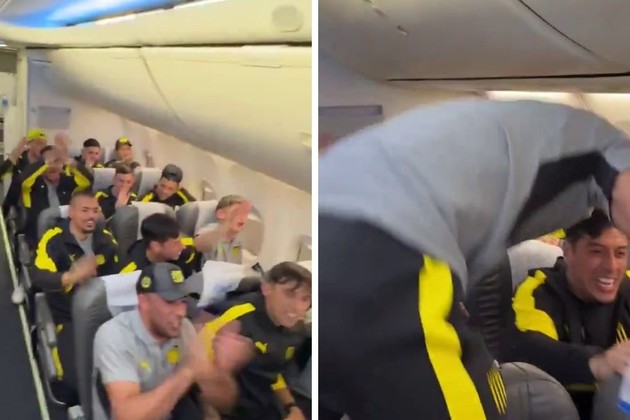 Como se aprecia en las imágenes, los charrúas cantaban, saltaban y se abalanzaban sobre los asientos del avión. En ese momento, una tripulante de cabina pasa y tranquiliza la arenga.