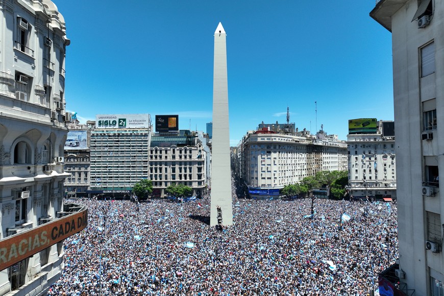 Una verdadera multitud se congregó desde temprano este martes en el Obelisco de la ciudad de Buenos Aires para poder ver a la Selección Argentina campeona del mundo. Finalmente, los jugadores no pudieron llegar hasta el centro porteño y sobrevolaron la zona a bordo de helicópteros.