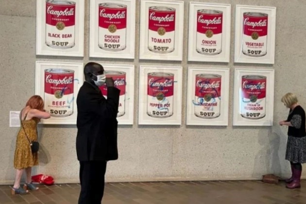 Dos activistas ambientales se adhirieron este miércoles con pegamento a la famosa obra de arte Latas de sopa Campbell del artista estadounidense Andy Warhol, en la Galería Nacional de Canberra para exigir al gobierno de Australia que deje de subsidiar los combustibles fósiles.