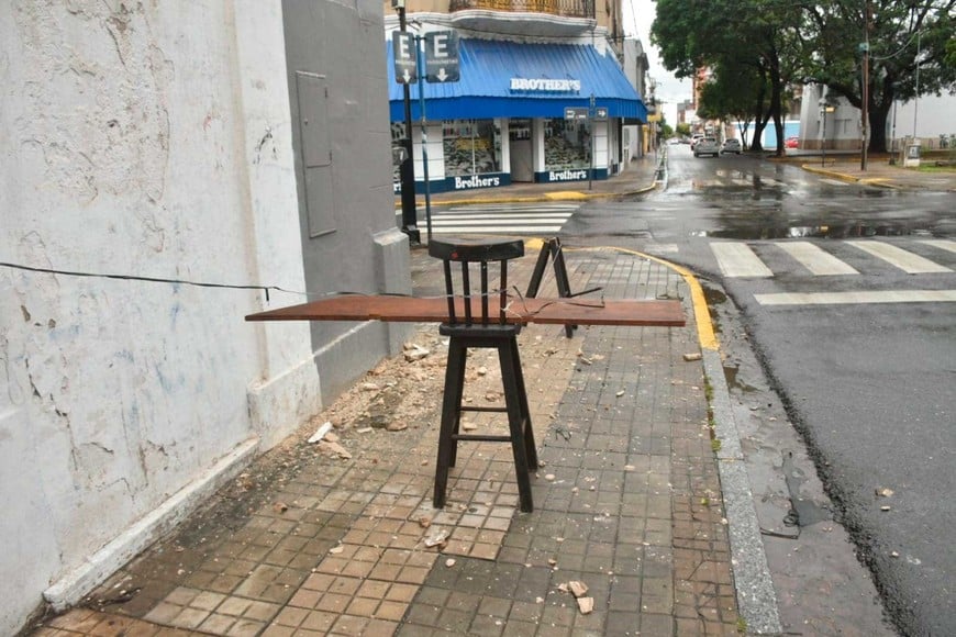 En la esquina de Salta y 1° de Mayo, frente al Palacio Municipal, cayó parte de la mampostería de un inmueble. Vallaron preventivamente la vereda.