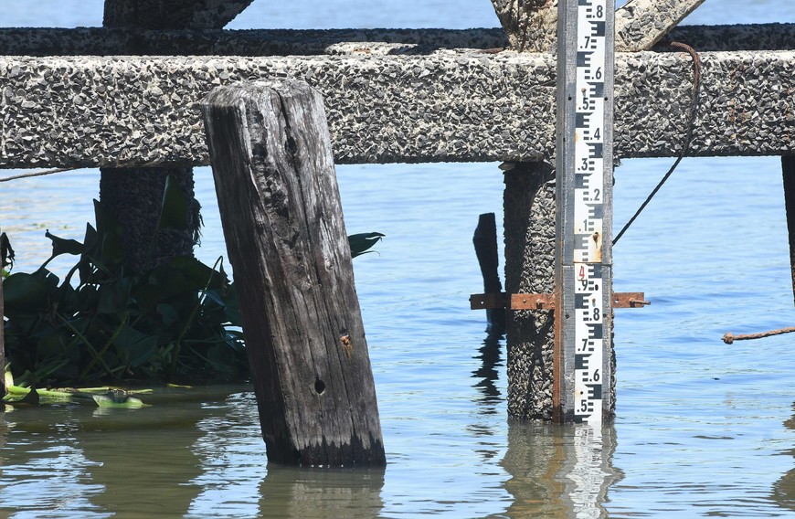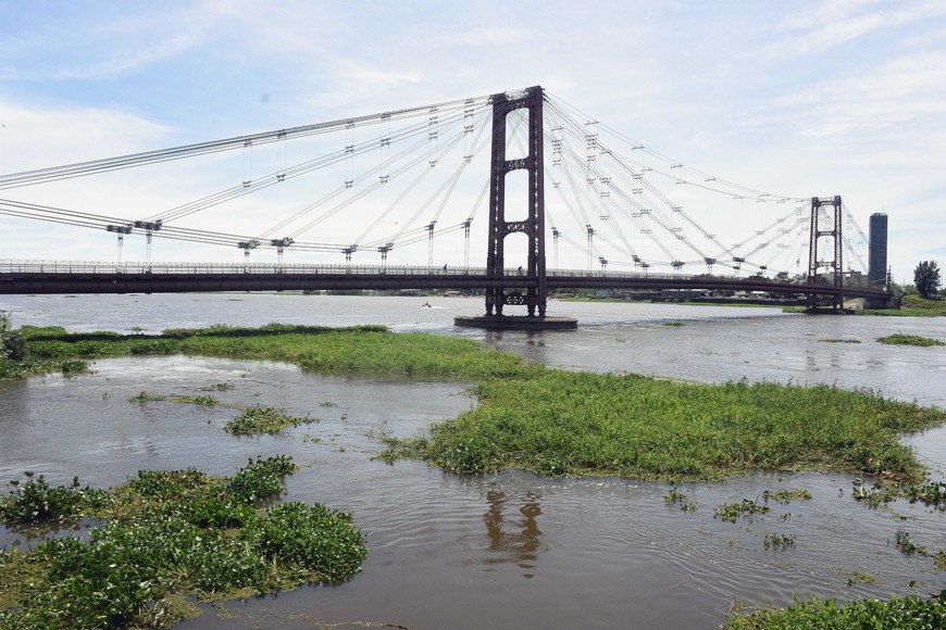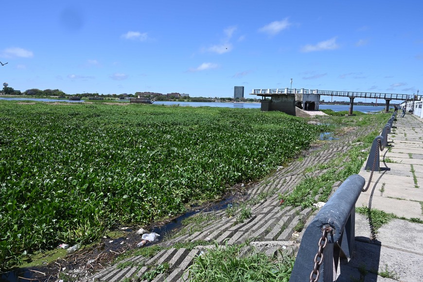 El nivel del Paraná superó los 4 metros en el puerto este martes. Plantas acuáticas en la orilla, los pilotes y entre los puentes.