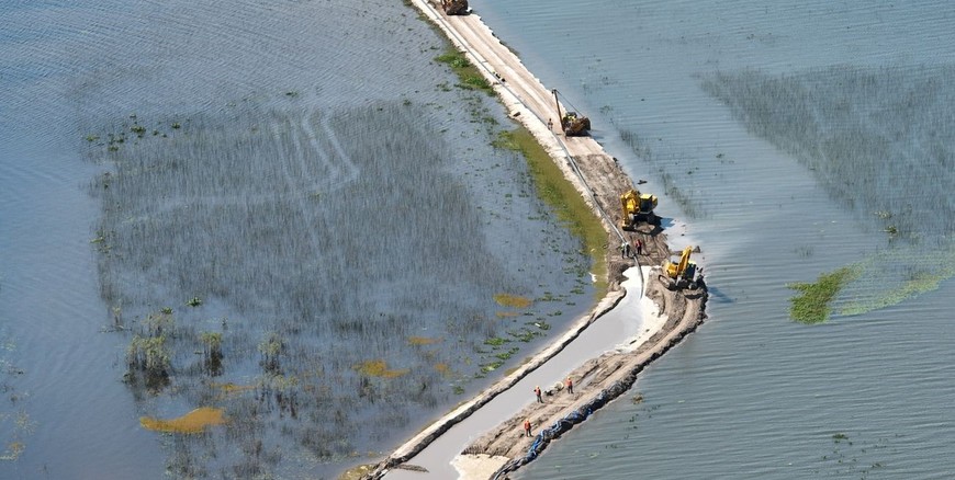 A contrarreloj, los operarios trabajan para concluir la tarea antes que el sector quede bajo agua por la crecida del río Paraná. Una vez que la cañería esté bajo tierra se desarmarán los terraplenes. Otro frente de obra avanza con el cruce del río Salado.