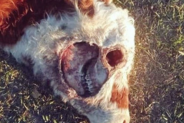 Un lugareño, mientras recorría su campo, halló un ternero muerto con una extraña marca en la cara: le faltaba un ojo y tenía un corte exactamente redondo en un solo lado de la cabeza con sangrado en la nariz.