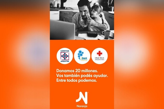 Naranja se suma a los donativos para fomentar la lucha contra el coronavirus en la Argentina y destinará $ 20 millones en partes iguales a Cáritas Argentina, Red Argentina de Bancos de Alimentos y Cruz Roja Argentina.