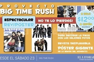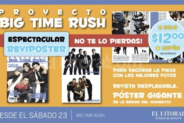 El proyecto televisivo norteamericano conocido como Big Time Rush, desembarca en el diario El Litoral con un espectacular reviposter para decorar tu dormitorio con las mejores imágenes de la banda del momento. Todos los sábados, a sólo más el cupón que publica el diario, o a sin cupón. ¡Pedíselo a tu canillita! La historia de Big Time Rush Todo comenzó un 28 de noviembre del año 2009, cuando fue lanzado por el canal televisivo Nickelodeon un adelanto de esta serie juvenil, que fue dividida en dos partes y titulada: Big Time Audition. El estreno llegó a Latinoamérica el 15 de abril y debido a la promoción efectuada por la empresa transmisora, fue considerado por los televidentes como una película creada para la pantalla chica. La serie comenzó a transmitirse de manera regular en Estados Unidos el 18 de enero de 2010, con el episodio titulado 'Big Time School of Rocque', que se convirtió en el capítulo más visto del proyecto, alcanzando una audiencia de casi siete millones de espectadores. Big Time Rush ha sobrevivido exitosamente durante tres temporadas, y su trama se basa en la vida de cuatro jóvenes residentes de Minnesota y jugadores de hockey que fueron elegidos para formar un grupo musical: James, Kendall, Carlos y Logan. Los actores principales de la serie son Kendall Schmidt, James Maslow, Carlos Pena Jr. y Logan Henderson, quienes comparten créditos con Stephen Kramer, Tanya Chisholm, Ciara Bravo y Katelyn Tarver, entre muchos otros nuevos talentos juveniles. En días pasados, el canal anunció el lanzamiento de una nueva temporada para el próximo año. El Litoral presenta Proyecto Big Time Rush. Se trata de un reviposter que se publica junto al diario El Litoral los sábados. La compra es opcional y sólo tenés que pedírselo a tu canillita cuando adquieras el diario. Proyecto Big Time Rush es una revista con un póster gigante desplegable para decorar tu habitación con las mejores fotos de la banda del momento.