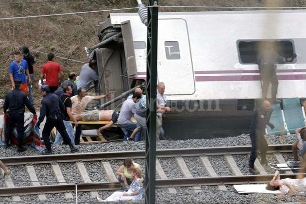 El accidente ocurrió con un tren Alvia en el trayecto entre las ciudades de Madrid y Ferrol, cerca de la ciudad de Santiago de Compostela y las autoridades ferroviarias confirmaron la muerte de al menos 30 personas que están esparcidos alrededor de la vía cubiertas con mantas