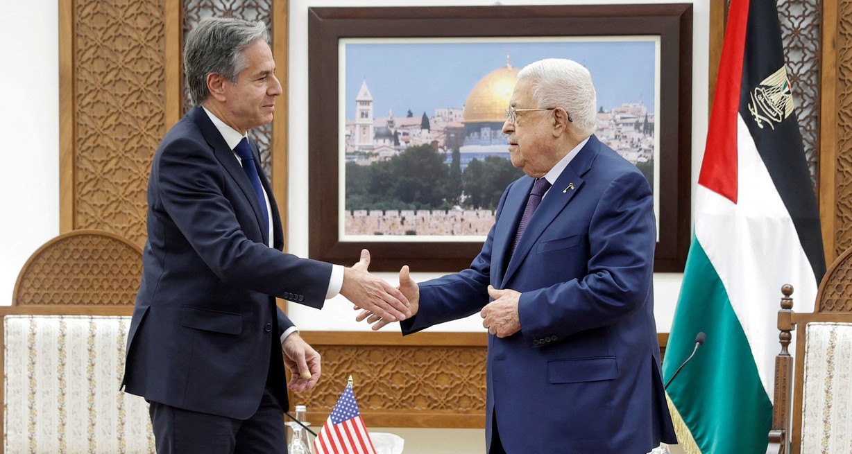 El secretario de Estado de Estados Unidos, Antony Blinken, se reunió hoy en Cisjordania con el presidente de la Autoridad Palestina, Mahmud Abbas, quien pidió un alto en la ofensiva de Israel en Gaza y dijo que la paz sólo se logrará con el fin de la ocupación israelí de Palestina.