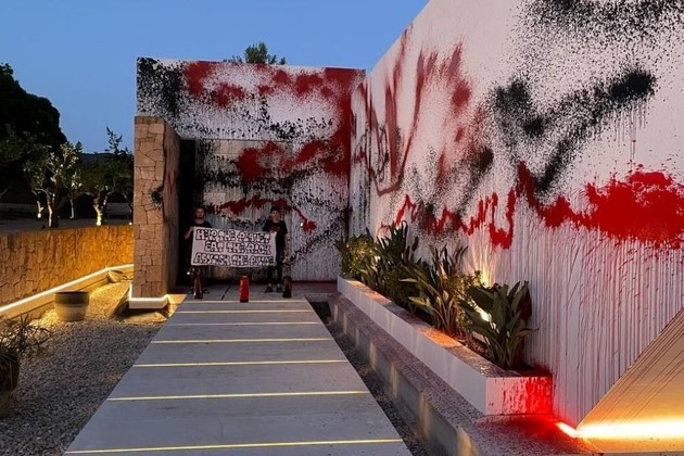 Activistas ambientales de Futuro Vegetal vandalizaron con pintura roja y negra la fachada de la mansión de Lionel Messi en Ibiza para denunciar la responsabilidad de los ricos en la crisis climática.