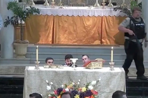 Unos dos minutos después, aunque no está claro por qué, la escena se vuelve caótica, con gritos y gente mirando frenéticamente a su alrededor. El párroco y un diácono se arrodillan detrás del altar. Detrás de ellos hay un agente con la pistola fuera de la funda. Unos 30 segundos después, los monaguillos corren detrás de los hombres arrodillados.