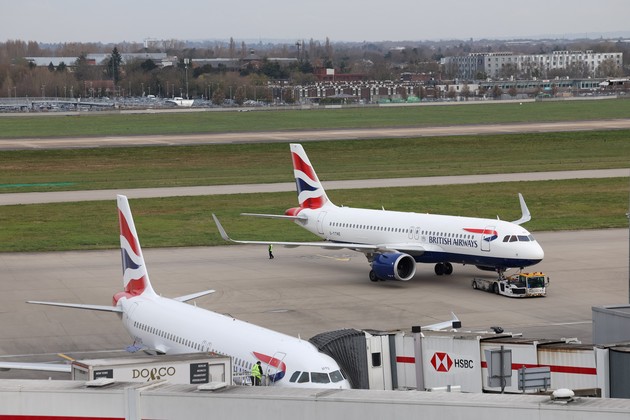 Aviones permanecen estacionados en la pista del aeropuerto internacional de Heathrow tras un incendio en una subestación eléctrica cercana que dejó sin suministro eléctrico al aeropuerto este viernes.