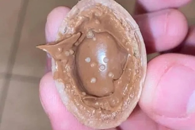 Por estas horas ya circulan imágenes en las redes sociales que muestran cómo luce la bacteria de salmonela en chocolates. Una persona separó la mitad del dulce y dentro se aprecian puntos blanquecinos.