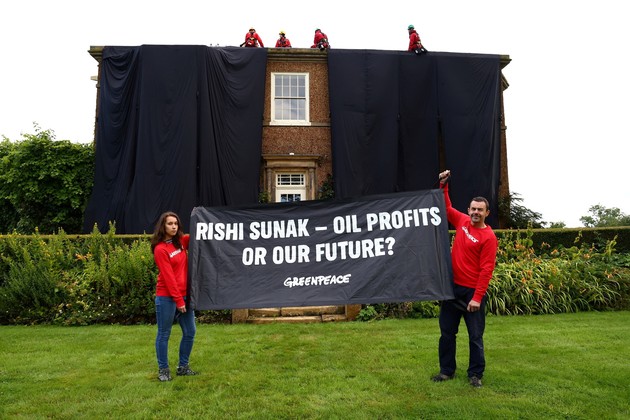 Activistas de la organización Greenpeace cubrieron este jueves la casa de verano del primer ministro británico, Rishi Sunak, en North Yorkshire, Inglaterra, con una tela de color negro como protesta por los planes gubernamentales de llevar adelante más perforaciones de petróleo y de gas en el Mar del Norte.