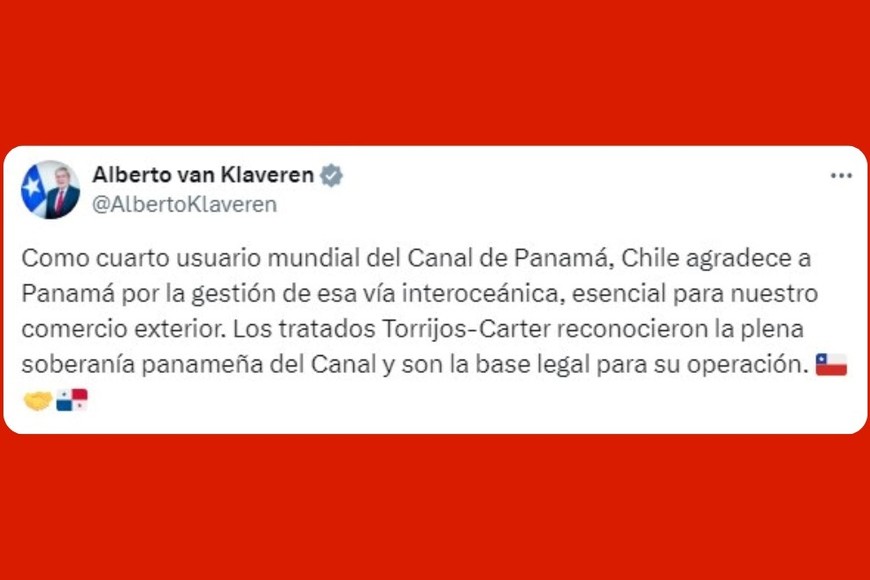 Van Klaveren subrayó que los tratados Torrijos-Carter reconoció la plena soberanía panameña del Canal y son la base legal para su operación. El domingo, durante un evento de la organización conservadora Turning Point USA en la ciudad estadounidense de Phoenix, Trump señaló que las tasas que cobra Panamá "son ridículas" por lo que advirtió que si se garantiza una "operación segura, eficiente y confiable" del canal, su gobierno exigirá que le "devuelvan el Canal de Panamá en su totalidad".