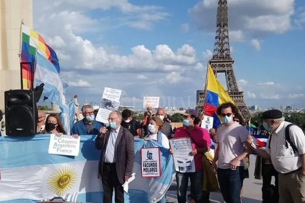 Varias decenas de argentinos e integrantes de organizaciones de derechos humanos latinoamericanas, ONGs y de fuerzas de izquierda del país galo, como Francia Insumisa (FI), que lidera el excandidato a presidente Jean-Luc Mélenchon; se concentraron poco después de las 13 de la Argentina (las 18 en París) en la Explanada de los Derechos Humanos, ubicada en Trocadero, uno de los principales puntos turísticos de la capital francesa, para rechazar la presencia de Macri en esa ciudad, en un "momento nacional y mundial de extrema precariedad" por la pandemia de coronavirus.
