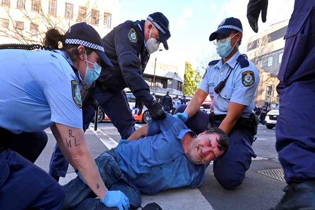 En Sydney, un grupo se enfrentó a la policía montada tirándoles macetas y botellas mientras que otros coreaban "libertad, libertad" durante una marcha por el distrito comercial de la ciudad.