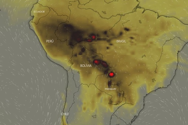Un mapa publicado por el portal Windy permite ver en tiempo real el avance de los focos de calor durante los devastadores incendios forestales que golpean desde hace días la Amazonia brasileña y Bolivia.