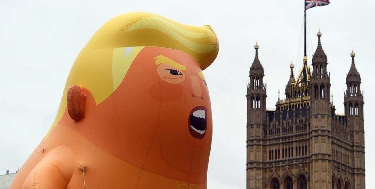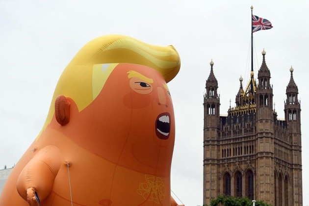 En la Plaza del Parlamento se podía ver desde primera hora a un grupo de organizadores ataviados con mamelucos y gorros rojos en los que se leía "los cuidadores de Trump" (Trump babysitters), que establecieron un cordón de seguridad mientras inflaban el globo anaranjado, describió la agencia de noticias EFE.