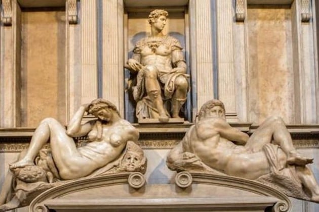 Alejandro está enterrado junto a su padre Lorenzo II de Médici y el grupo se destaca por las alegorías de Aurora y Crepúsculo a los pies de la estatua del gobernante.