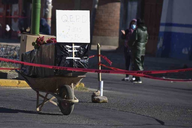 Agencias Un ataúd envuelto en plástico que contiene los restos de un hombre no identificado y que murió la semana pasada con síntomas de Covid-19 fue colocado en una carretilla en medio de la calle por los familiares para llamar la atención de las autoridades y lograr que sea enterrado, en Cochabamba, Bolivia.