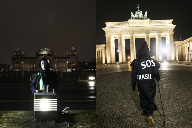 Disfrazado con una capa negra con capucha que dice Brasil en la espalda y con una careta de calavera, su recorrido sigue por la Puerta de Brandeburgo y luego por el cercano Parlamento alemán.