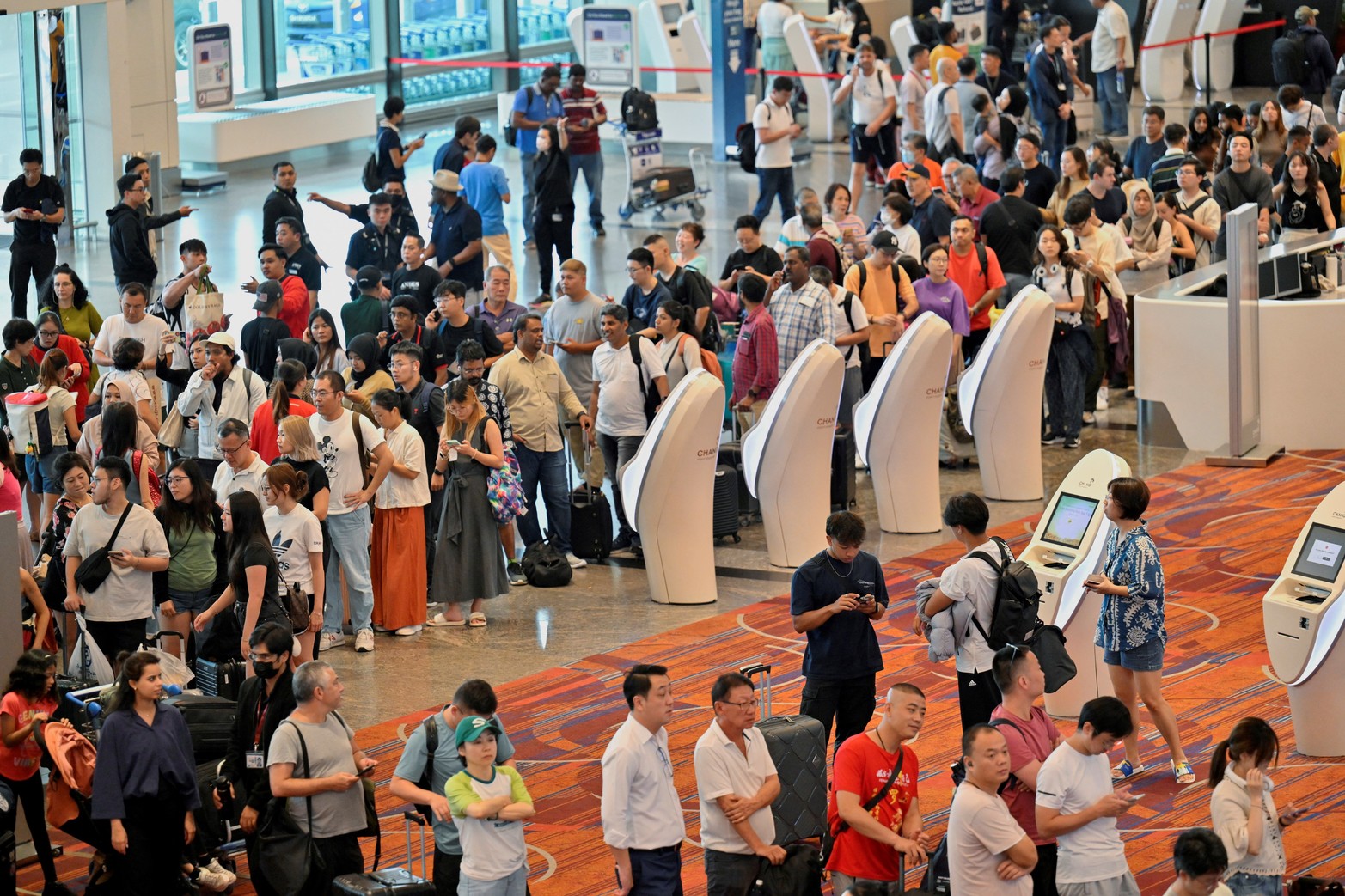 1 / 10 Pasajeros de Scoot esperan a ser facturados manualmente en la Terminal 1 del aeropuerto de Changi en Singapur después de una interrupción global del sistema. Foto: Caroline Chia