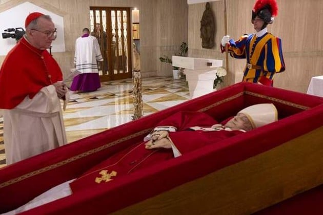 El cardenal italiano Pietro Parolin, junto al féretro de Francisco. Vatican Media