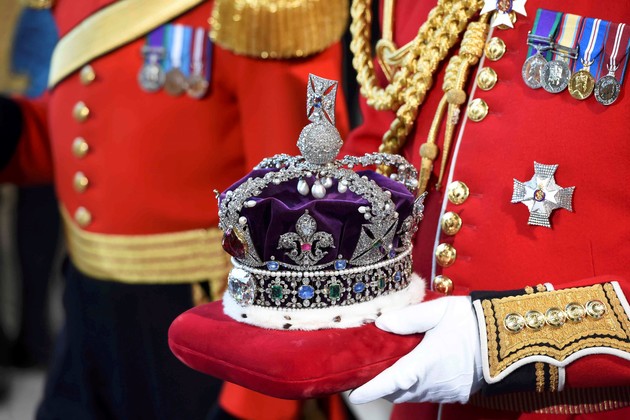 La corona de San Eduardo, llamada así por el último rey anglosajón, Eduardo el Confesor, está hecha de oro macizo y presenta más de 400 piedras preciosas, incluidos rubíes, granates y zafiros. La versión que se utilizará el próximo año fue realizada originalmente para Carlos II en 1661, mide 30 centímetros de alto y pesa 2,23 kilogramos. Por lo general, se mantiene bajo vigilancia en la Torre de Londres.