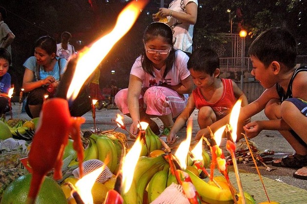Los "pretas" son los espíritus de los que murieron como consecuencia de un accidente o ahogamiento y cuyos cuerpos, en consecuencia, nunca pudieron ser enterrados. La presencia de "pretas" entre la vida es considerado por los chinos como algo peligroso. Bajo la orientación de los templos budistas, las sociedades se organizan para llevar a cabo ceremonias en honor de los "pretas", que incluye la iluminación con las lámparas. Se invita a los monjes a recitar versos sagrados y las ofrendas de frutas se presentan.