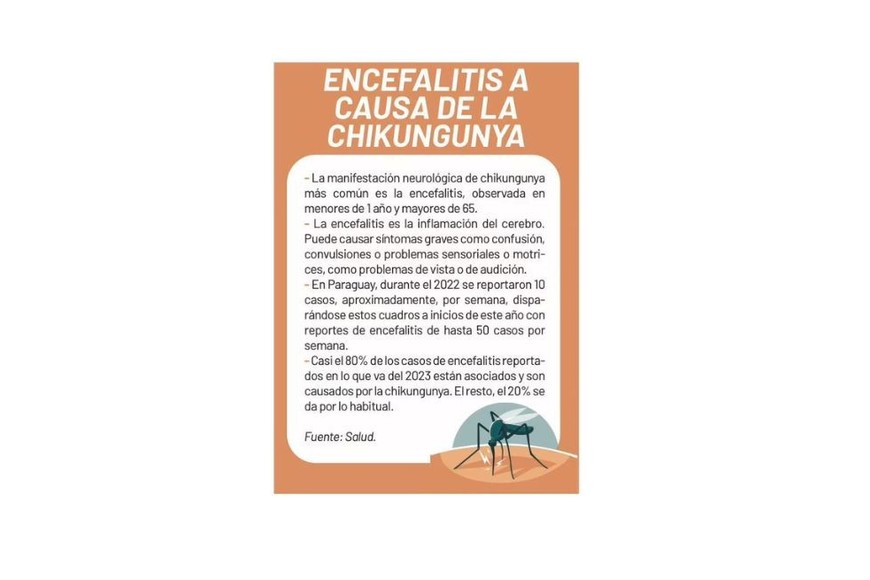 El Ministerio de Salud registra un aumento considerable de cuadros de encefalitis que están asociados al diagnóstico de chikungunya. Según los datos, durante el 2022 se reportaron 10 casos aproximadamente por semana, disparándose estos cuadros a inicios de este año con reportes de encefalitis de hasta 50 casos por semana.