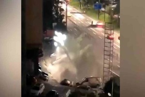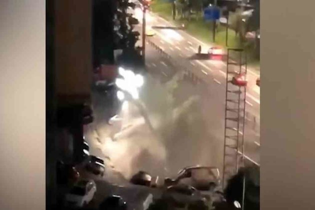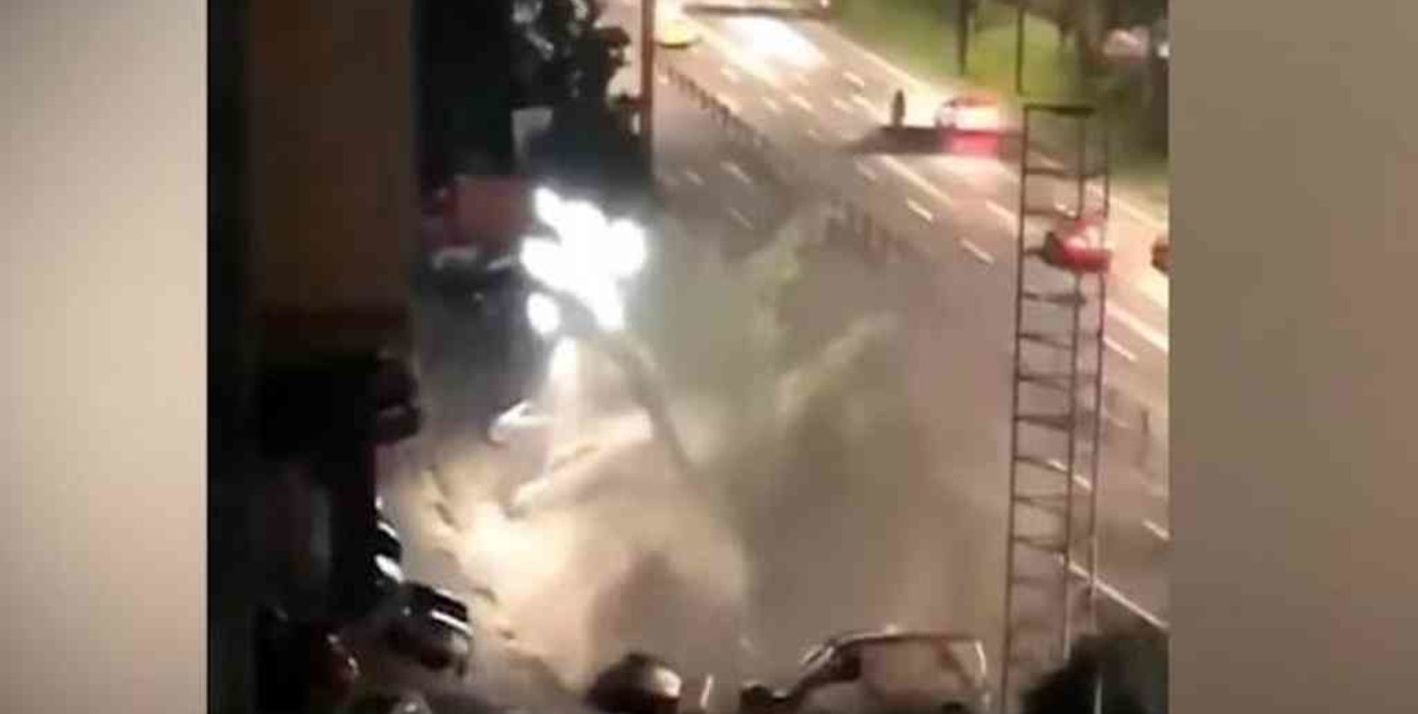 En las imágenes se puede ver el momento en que los autos estacionados cerca de un centro comercial cayeron en un enorme socavón cuando en la carretera frente al edificio se derrumbó repentinamente.