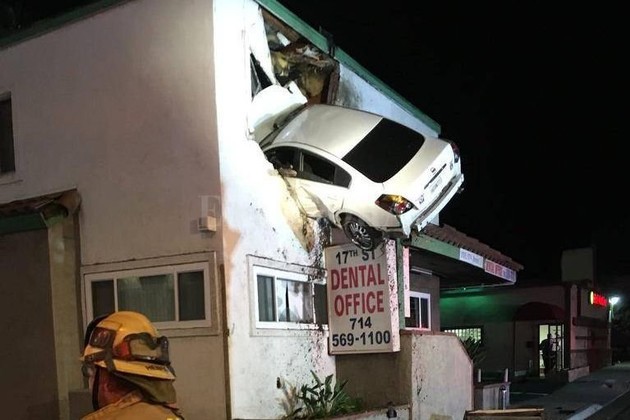 El vehículo (un Nissan Altima blanco) chocó contra el separador que divide los carriles de diferentes direcciones, alrededor de las 5 de la mañana (hora de California), lo que provocó que volara en el aire y quedara incrustrado en el segundo piso de una oficina dental en Santa Ana, California, dijo la Autoridad de Bomberos del Condado de Orange.