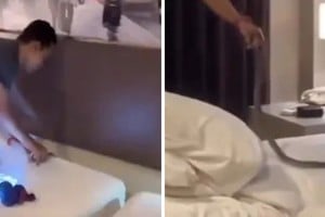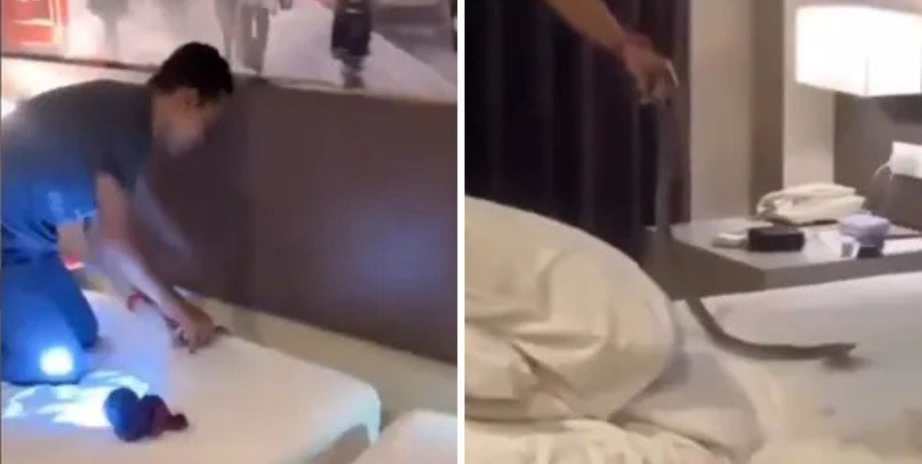 La escena tuvo además un detalle todavía más inquietante. La serpiente no solo se desplazaba sobre el colchón, sino que emitía un siseo constante dentro del cuarto, un sonido que terminó de confirmar que el peligro estaba ahí, a pocos centímetros de los huéspedes.