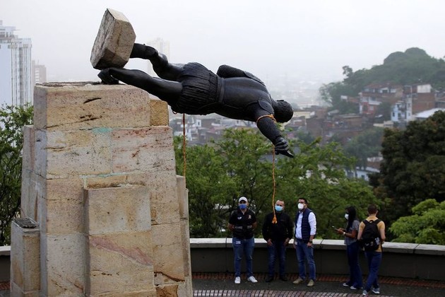 “Tumbamos a Sebastián de Belalcázar en memoria de nuestro cacique Petecuy, quien luchó contra la corona española, para que hoy sus nietos y nietas sigamos luchando para cambiar este sistema de gobierno criminal que no respeta los derechos de la madre tierra”, señaló el movimiento de Autoridades Indígenas del Sur Occidente. En las imágenes y videos del acto que se difundieron en redes sociales se observa la estatua caída, sin desprenderse del todo de su pedestal. Miembros del Escuadrón Móvil Antidisturbios (Esmad) de la policía dispersaron en la mañana a los indígenas.