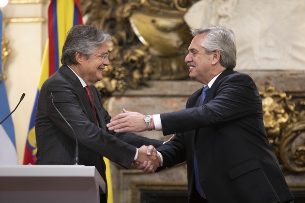 El presidente argentino, Alberto Fernández (d), saluda a su homólogo de Ecuador, Guillermo Lasso (i), durante la firma de una Declaración Presidencial Conjunta en el Salón Blanco de la Casa de Gobierno. Crédito: Xinhua/Martín Zabala
