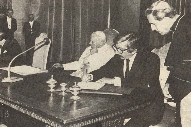 Acuerdo definitivo. Bajo el arbitraje de Juan Pablo II, lo rubricaron el argentino Dante Caputo y el chileno Jaime del Valle en la Ciudad del Vaticano, en su calidad de ministros de Relaciones Exteriores intervinientes. Gentileza