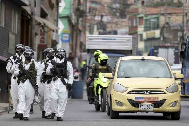 Agencias Soldados con trajes de protección contra el coronavirus patrullan Ciudad Bolívar, un vecindario con muchos contagios, en julio de 2020, en Bogotá, Colombia.
