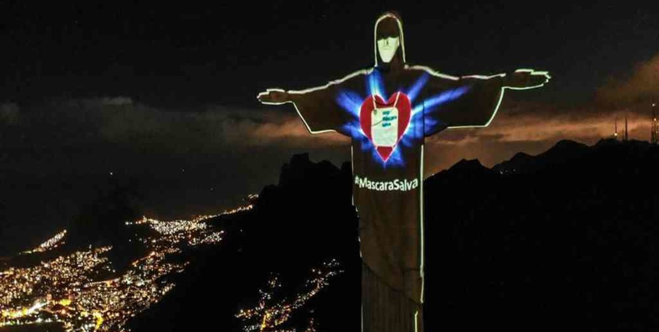 El Cristo Redentor de Río de Janeiro lució este domingo una máscara proyectada en su cuerpo para concientizar a la población de la importancia de su uso durante la pandemia de coronavirus, que continúa su expansión por Brasil.