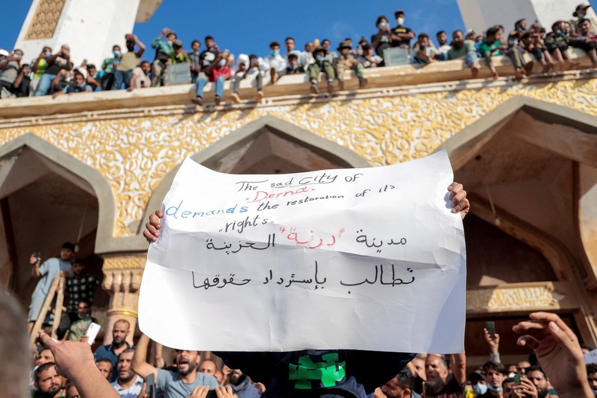 Protesta frente a la mezquita de al Sahaba contra el gobierno en Derna, Libia, el 18 de septiembre de 2023. Foto: Reuters