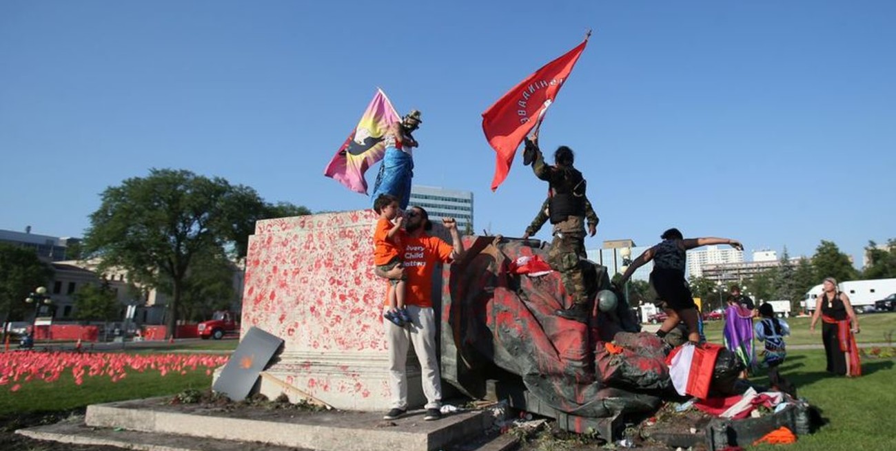 En Winnipeg, una multitud vitoreó cuando la estatua de la reina Victoria cayó fuera de la legislatura provincial de Manitoba. Los manifestantes, muchos de los cuales vestían ropa naranja, también patearon la estatua derribada y bailaron alrededor de ella. El pedestal y la estatua estaban pintados con marcas de manos de pintura roja. También se derribó una estatua cercana de la reina Isabel. Ella es la actual jefa de estado de Canadá, mientras que Victoria reinó desde 1837 hasta 1901 cuando Canadá era parte del Imperio Británico.