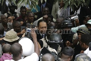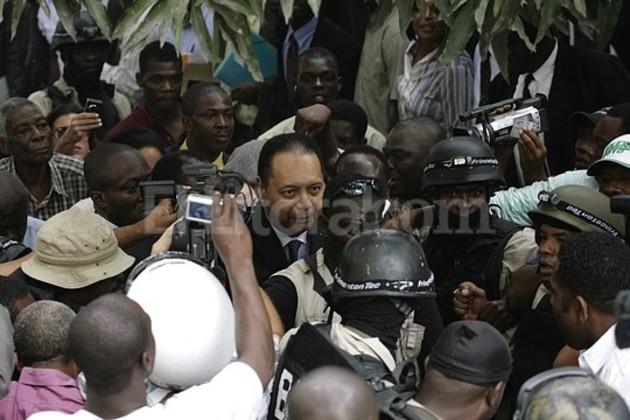 Al auto policial le costó avanzar, porque los simpatizantes de "Baby Doc" se empeñaban en expresar su respaldo en una pequeña calle lateral del hotel y otros haitianos cantan para festejar la detención, lo que generó algunos tumultos.