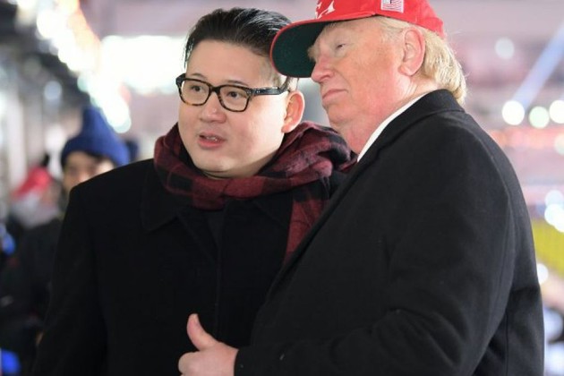 El imitador Howard X, residente en Hong Kong, cuyas parodias de Kim han dado la vuelta al mundo, apareció junto a Dennis Alan, caracterizado como Trump.