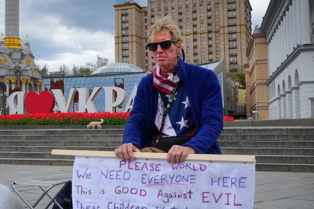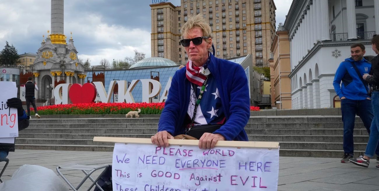 El hombre fue fotografiado en mayo de 2022 en Kiev en una manifestación exigiendo más asistencia humanitaria internacional para los civiles.