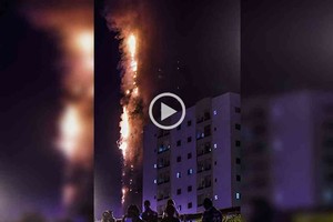 Imágenes tomadas desde las calles y edificios adyacentes difundidas en las redes sociales muestran el edificio rodeado de llamas y fragmentos cayendo incandescentes al vacío.