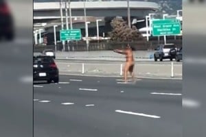 En su llamada al 911 informó que una mujer les había apuntado con un arma, cerca de las 17, en el tramo I-80, que pasa por la Bahía de San Francisco. La Policía precisó que la agresora había salido antes, también desnuda, con un cuchillo. Allí se acercó a los conductores, les gritó y los amenazó.