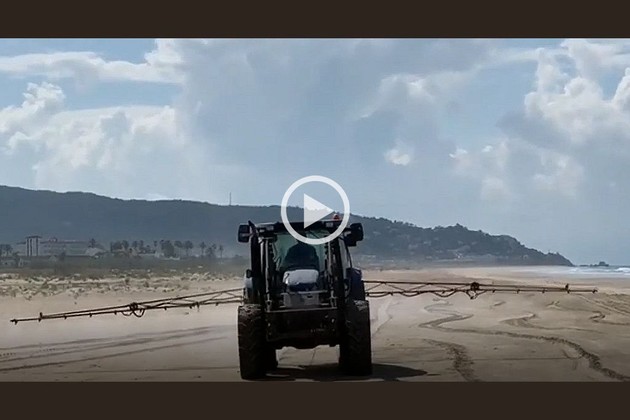 Tres tractores usados para fumigar campos de cultivo recorrieron un tramo de playa rociando 1,000 litros de agua con una concentración de 2% de cloro, reportó el Diario de Cádiz.